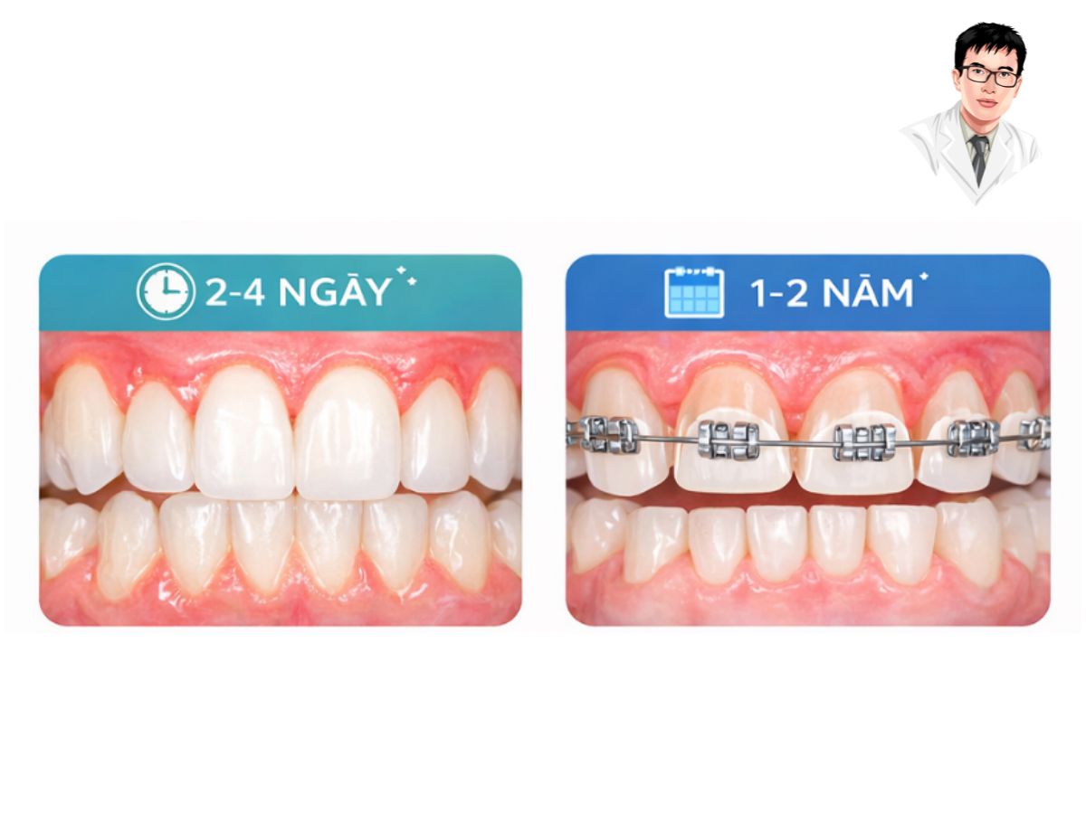 Bọc răng sứ thường chỉ mất từ 2 đến 4 ngày. Trong khi đó, niềng răng cần từ 1 đến 2 năm để đạt hiệu quả.