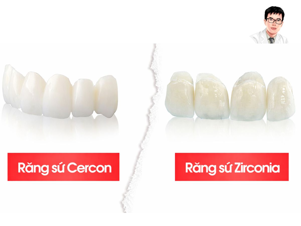 Zirconia nổi bật về độ bền, phù hợp với răng hàm. Cercon lại có màu sắc tinh tế, phù hợp với răng cửa.